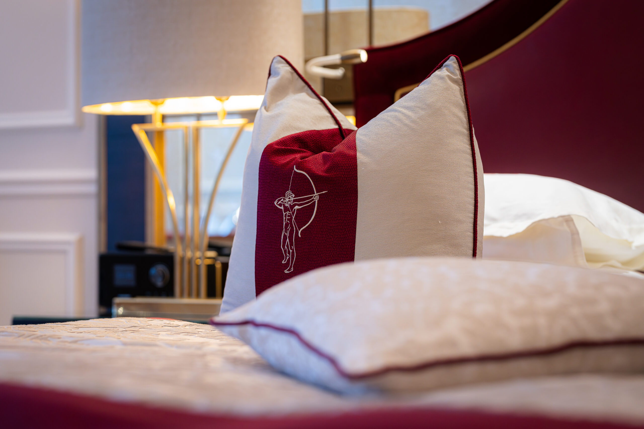 Der großzügige Wohnbereich im klassischen Stil bietet stilvolle Behaglichkeit. Das Badezimmer aus edlem Calacata-Marmor ist mit erlesenen Accessoires und luxuriösen Pflegeprodukten ausgestattet und verfügt – je nach Suite – über Dusche, Badewanne sowie separates WC.
